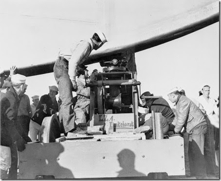 The ground crew attaches the Hindenburg’s aft mooring spindle to the stern car at Lakehurst during a landing in 1936.