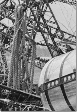 The curving pipe that rises from the ladder’s upright appears to be holding the bottom of the gas cell up and away from the mooring area. However, it is unmistakable how closely the hydrogen gas bag surrounded the crew on the mooring platforms.
